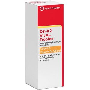 Anwendungsgebiet von D3 + K2 Vit AL 1000 I.E. / 50 µg Tropfen: ein starkes Duo für die KnochenD3 + K2 Vit AL 1000 I.E. / 50 µg Tropfen: ein starkes Duo für die Knochen ist ein Nahrungergänzungsmittel mit Vitamin D3 und K2. Vitamin D besitzt verschiedene positive Eigenschaften und spielt daher eine bedeutende Rolle für unsere Gesundheit. Bei ausreichender Sonneneinstrahlung wird es in unserer Haut gebildet. Jedoch ist die Produktion in der dunkleren Jahreszeit erschwert. Um ausreichend mit Vitamin D versorgt zu sein, eignet sich die Aufnahme eines Nahrungsergänzungsmittels wie D3 + K2 Vit AL 1000 I.E. / 50 µg Tropfen: ein starkes Duo für die Knochen. Vitamin D trägt zum Erhalt normaler Knochen, Zähne und der Muskelfunktion bei. Außerdem sit das Vitamin an der Zellteilung beteiligt. Das zusätzlich in D3 + K2 Vit AL 1000 I.E. / 50 µg Tropfen: ein starkes Duo für die Knochen enthaltene Vitamin K trägt zur Einbindung von Calcium in die Knochen bei.Wirkstoffe / Inhaltsstoffe / ZutatenZutaten von D3 + K2 Vit AL 1000 I.E. / 50 µg Tropfen: ein starkes Duo für die Knochen: Mittelkettige Triglyceride (Kokosöl), Vitamin K2 (Menachinon), Vitamin D3 (Cholecalciferol), Antioxidationsmittel α-Tocopherol. D3 + K2 Vit AL 1000 I.E. / 50 µg Tropfen: ein starkes Duo für die Knochen ist für Vegetarier geeignet, frei von Konservierungsmitteln, künstlichen Farbstoffen, Soja, Milcheiweiß, Gluten und Laktose. GegenanzeigenBei bekannter Überempfindlichkeit gegenüber einen der oben genannten Inhaltsstoffe sollte das Produkt nicht angewendet werden.DosierungVerzehrsempfehlung von D3 + K2 Vit AL 1000 I.E. / 50 µg Tropfen: ein starkes Duo für die Knochen: Erwachsene verzehren täglich 3 Tropfen von D3 + K2 Vit AL 1000 I.E. / 50 µg Tropfen: ein starkes Duo für die Knochen mit etwas Wasser zu jeder beliebigen Mahlzeit. Die Einnahme zu einer öl- oder fetthaltigen Mahlzeit kann die Resorption der enthaltenen Inhalt