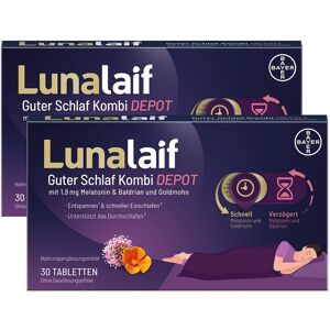 Nahrungsergänzungsmittel sind kein Ersatz für eine ausgewogene und abwechslungsreiche Ernährung und eine gesunde Lebensweise. Lunalaif Guter Schlaf Kombi Depot Lunalaif® Guter Schlaf Kombi Depot hilft, besser ein¹- und durchzuschlafen³ kombiniert Melatonin und hochdosierte pflanzliche Inhaltsstoffe für einen erholsamen Schlaf³ mit Depot-Technologie: kontinuierliche Freisetzung der Inhaltsstoffe die ganze Nacht besseres Ein¹- und Durchschlafen³ dank besonderer Freisetzungstechnologie ohne Gewöhnungseffekt und Tagesmüdigkeit 1 Melatonin trägt zur Verkürzung der Einschlafzeit bei ² Goldmohn und Baldrian tragen zur Entspannung bei ³ Baldrian trägt zur Aufrechterhaltung des Schlafs bei Besser schlafen, um erholt in den Tag zu starten Guter Schlaf ist wichtig für unsere Gesundheit und unsere Leistungsfähigkeit. Aufgrund anhaltender oder wiederkehrender Probleme beim Ein- und Durchschlafen bleibt vielen dieser erholsame Schlaf jedoch verwehrt. Beinahe jede zweite Person in Deutschland hat Durchschlafprobleme und wird nachts immer wieder wach. Zu den häufigsten Gründen zählen emotionaler und beruflicher Stress sowie Gesundheitsprobleme. Doch auch zu viel Zeit vor dem Bildschirm kann dafür sorgen, dass man abends schlechter einschläft und eine unruhige Nacht durchlebt. Denn das blaue Licht von Handy- oder Computerbildschirmen beeinträchtigt die Produktion des Schlafhormons“ Melatonin. Dieses sorgt dafür, dass wir abends müde werden, und spielt eine entscheidende Rolle für unseren Tag-Nacht-Rhythmus. Je länger Ein- und Durchschlafprobleme vorliegen, desto größer werden die negativen Einflüsse auf den Alltag. Wer morgens aufwacht, aber nicht erholt ist, kann sich deutlich schlechter konzentrieren. Zudem steigt das Risiko für viele körperliche Erkrankungen sowie Infektionen, da das Immunsystem durch Schlafmangel geschwächt werden kann. Um besser schlafen zu können, greifen deshalb viele auf natürliche Einschlafhilfen zurück. Lunalaif® Guter Schlaf Kombi Depot ist besonders geeignet, um Probleme mit dem Ein- und Durchschlafen zu reduzieren. Die natürliche Schlafhilfe kombiniert Melatonin mit einer hohen Konzentration an Goldmohn- und Baldrianextrakten. So wird die Einschlafzeit verkürzt1 und das Durchschlafen gefördert³. Damit könnte häufiges Aufwachen in der Nacht bald der Vergangenheit angehören. Besser einschlafen und durchschlafen dank Depot-Technologie Lunalaif® Guter Schlaf Kombi Depot enthält 1,9 mg Melatonin. 1 mg davon wird etwa 30 Minuten nach der Einnahme freigesetzt. Das erhöht die Schlafbereitschaft und man schläft schneller ein. Gleichzeitig werden 80 mg Goldmohnextrakt und 90 mg Baldrianextrakt an den Körper abgegeben. Beide Pflanzen wirken entspannend und unterstützen die Schlafqualität. Damit nicht nur die Einschlafzeit verkürzt1, sondern auch Durchschlafprobleme verringert³ werden, arbeitet Lunalaif® Guter Schlaf Kombi Depot mit der Depot-Technologie. Diese sorgt dafür, dass im Laufe der Nacht weitere 0,9 mg Melatonin zusammen...