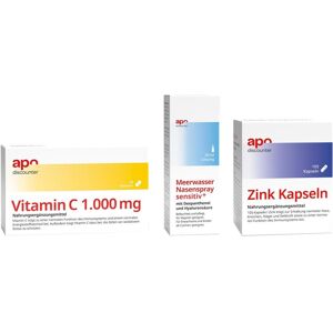 Anwendungsgebiet von Immunsystem Sparset-Vitamin C + Zink + befeuchtendes NasensprayVitamin C Tabletten 1000 mg (Packungsgröße: 60 stk) sind ein hochdosiertes Nahrungsergänzungsmittel, das Ihren Körper mit dem essenziellen Vitalstoff versorgt. Denn Vitamin C stärkt unsere Abwehrkräfte, fördert das Wohlbefinden und sorgt für Schwung und Energie. Fehlt es dem menschlichen Organismus, ist sein Immunsystem geschwächt. Wir werden schneller müde und sind anfälliger für Infekte und andere Krankheiten. Sie können außerdem einer Erkältung vorbeugen, indem Sie Ihre körpereigene Abwehr stärken - etwa mit einer ausgewogenen Ernährung, viel Schlaf und ausreichend Bewegung. Das Präparat kann zur Behandlung eines Mangels an Vitamin C eingesetzt werden, genauso wie zu dessen Vorbeugung. Zink Kapseln 10 mg von apodiscounter (Packungsgröße: 105 stk) sind ein hochwertiges Nahrungsergänzungsmittel, das zur Unterstützung eines gesunden Körpers beitragen kann. Zink ist ein essenzielles Spurenelement, das eine wichtige Rolle bei vielen körperlichen Prozessen spielt. Unsere Zink Kapseln 10 mg von apodiscounter (Packungsgröße: 105 stk) enthalten 10 mg Zink pro Portion und tragen zu einer normalen Funktion des Immunsystems bei, was besonders in Zeiten erhöhter Belastung wichtig ist. Zudem trägt Zink zur Erhaltung normaler Haut, Haare und Nägel bei und kann helfen, die Sehkraft zu unterstützen. Pflegendes Nasenspray mit Hyaluron und Dexpanthenol (Packungsgröße: 20 ml) reinigt die Nase schonend, befeuchtet deren Schleimhaut und schützt vor dem Austrocknen. Die in der Nasenpflege enthaltenen Stoffe Aloe Vera und Panthenol wirken beruhigend auf die Nasenschleimhaut und fördern zusammen mit Glycerol ihre Befeuchtung. Das Nasenspray eignet sich damit auch vorbeugend bei einem Aufenthalt in Räumen mit niedriger Luftfeuchte gegen das Austrocknen, kann außerdem das Risiko von Nasenschleimhautentzündungen und Allergien mindern. Eine t