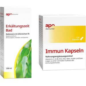 Anwendungsgebiet von Schnupfen Sparset - Immun Kapseln + Erkältungszeit BadImmun Kapseln (Packungsgröße: 120 stk) sind ein Nahrungsergänzungsmittel mit essenziellen Vitaminen und Mineralstoffen – ein Beitrag für eine normale Immunsystem-Funktion. Vitamin C erhöht die Eisenaufnahme trägt zu einer normalen Funktion des Immunsystems während & nach intensiver körperlicher Betätigung bei und trägt zu einer normalen Kollagenbildung für eine normale Knorpelfunktion bei. Vitamin C, Vitamin B2 und E, Zink, Kupfer und Selen tragen dazu bei, die Zellen vor oxidativem Stress zu schützen. Vitamin C, B1, B6 & B2, Pantothensäure, Eisen, Mangan, Biotin, Jod und Niacin tragen zu einem normalen Energiestoffwechsel bei. Vitamin C, B1, B6 & B2, Mangan, Kupfer, Jod und Niacin tragen zu einer normalen Funktion des Nervensystems bei. Vitamin C, B1 & B6, Mangan, Biotin und Niacin tragen zur normalen psychischen Funktion bei. Vitamin A, D3 & B6, Zink, Eisen, Kupfer und Selen tragen zu einer normalen Funktion des Immunsystems bei. Eisen trägt zur normalen Bildung von roten Blutkörperchen und Hämoglobin bei. Erkältungszeit Bad von apodiscounter (Packungsgröße: 200 ml): Je nach Wannengröße für in Vollbad circa 2-3 Verschlusskappen (20-30ml) des Erkältungsbads dem einlaufenden Badewasser zugeben. Die Temperatur des Wassers sollte 35-38 ⁰C betragen. Die normale Badezeit sollte 20 Minuten nicht überschreiten. Wirkstoffe / Inhaltsstoffe / ZutatenZutaten von Immun Kapseln (Packungsgröße: 120 stk): L-Ascorbinsäure, Kapselhülle Hydroxypropylmethylcellulose, Füllstoff mikrokristalline Zellulose, Nicotinamid, dl-alpha Tocopherylacetat, Eisengluconat, Zinkgluconat, Beta-Carotin, Thiaminmononitrat, Riboflavin, Calcium-D-pantothenat, Citrus Bioflavonoide, Mangangluconat, Pyridoxinhydrochlorid, Mittelkettige Triglyceride aus Pflanzenöl (Kokosnuss, Rapssaat), Tagetesb
