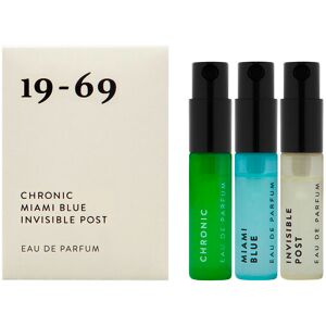 Eine Kollektion im Taschenformat, bestehend aus 3 Düften. Dieses Set enthält: 1 x Chronic, Eau de Parfum, 2,5 ml1 x Miami Blue, Eau de Parfum, 2,5 ml1 x Invisible Post, Eau de Parfum, 2,5 ml Jeder Duft ist inspiriert von einer anderen Epoche, Kultur oder Umgebung in Afrika, Europa, den USA und Asien. Kunst, Musik, Trends und Kulturen haben ihre Spuren in den Düften hinterlassen, sowohl in Bezug auf den Inhalt, den Namen und die Verpackung. Die Glasflaschen werden in Italien lackiert und im Siebdruckverfahren bedruckt. Jedes 19-69-Produkt ist handgefertigt, daher sollten kleine Abweichungen als Teil des Charakters betrachtet werden. Alle Rohstoffe werden sorgfältig geprüft und ausgewählt, um die beste Qualität zu gewährleisten. Für jeden Duft gibt es eine einzigartige Duftreise.