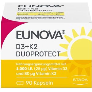 Nahrungsergänzungsmittel sind kein Ersatz für eine abwechslungsreiche und ausgewogene Ernährung und eine gesunde Lebensweise.EUNOVA® D3 + K2 DuoProtect – 1.000 I.E. FÜR IMMUNSCHUTZ UND KNOCHEN-POWER*Vitamin D unterstützt nicht nur die normale Funktion des Immunsystems, es ist auch wichtig für die Erhaltung normaler Knochen. Denn Knochen sind eine lebende Substanz und werden ständig neu aufgebaut, umgebaut und abgebaut. Während bis zum Alter von etwa 30 Jahren die Knochenmasse zunimmt, verringert sie sich danach altersbedingt um etwa ein Prozent pro Jahr. Durch den Abfall des Östrogenspiegels bei Frauen während bzw. nach den Wechseljahren kann die Abnahme der Knochenmasse auf bis zu vier Prozent pro Jahr ansteigen.1 Doch der überwiegende Abbau von Knochenmasse ist nicht nur ein Problem älterer Frauen. Auch Männer sind betroffen. Es lohnt sich für beide Geschlechter, einem sich häufig schleichend entwickelnden Knochenschwund vorzubeugen. Um die Knochen zu unterstützen und optimal zu versorgen, ist insbesondere Vitamin D wichtig. Vitamin D fördert die Aufnahme und Verwertung von Calcium und sorgt so für eine gute Calciumversorgung des Knochens. *Die Vitamine D und K tragen zur Erhaltung normaler Knochen bei.Die Kombination der sich ergänzenden Vitamine D3 und Vitamin K2 in einem Präparat ist im Hinblick auf die Ernährungsphysiologie sinnvoll. EUNOVA® DuoProtect leistet als 2-in-1-Nahrungsergänzungsmittel eine wertvolle Ergänzung zu einer gesunden Ernährung und bewussten Lebensweise. Es hilft Ihnen, die täglich benötigte Menge an Vitamin D und Vitamin K ganz bequem einzunehmen.PRODUKTPROFIL Nur mit veganen oder vegetarischen Zutaten Ohne Gelatine Ohne Konservierungsstoffe Ohne künstliche Farbstoffe Gluten- und laktosefreiZutaten:Füllstoff Mikrokristalline Cellulose, Hydroxypropylmethylcellulose, Trennmittel Stearinsäure, Verdickungsmittel Gummi arabicum, Saccharose, Stärke, Farbstoff , pflanzliches Öl, TrennmittelSiliciumdioxid, Vitamin K2 (Menachinon), Vitamin D3 (Cholecalciferol), Antioxidationsmittel ?-Tocopherol.EUNOVA® DuoProtect D3 + K2 ist für Vegetarier geeignet.Dieses Produkt ist FREI von Konservierungsmitteln, künstlichen Farbstoffen,Soja, Milcheiweiß, Gluten und Laktose.Nährwerte:Durchschnittliche Nährwerte:pro 1 Kapsel% NRV*Vitamin D31000 I.E. (25µg)500%Vitamin K280 µg107%*Referenzmenge gemäß LebensmittelinformationsverordnungVerzehrempfehlung:Kapseln: 1 Kapsel am Tag zu einer beliebigen Mahlzeit mit etwas Wasser einnehmen. Die Einnahme zu einer öl- oder fetthaltigen Mahlzeit kann die Resorption positivbeeinflussen.Tropfen: 3 Tropfen einmal täglich direkt in den Mund eintropfen oder in etwas Flüssigkeit geben. Die fettlöslichen Vitamin D3 und K2 sind in Öl gelöst, daher kann EUNOVA® D3+K2 DuoProtect unabhängig von den Mahlzeiten eingenommenwerden.Hinweis:Die angegebene empfohlene tägliche Verzehrmenge darf nicht überschritten werden.Aufbewahrung:Kühl (6-25 °C) und lichtgeschützt lagern. Außerhalb der Reichweite von kleinen Kindern...
