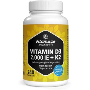 Nahrungsergänzungsmittel sind kein Ersatz für eine ausgewogene, abwechslungsreiche Ernährung und eine gesunde Lebensweise. DIE VORTEILE VON VITAMIN D3 2.000 IE + K2 Allrounder für die Gesundheit: Vitamin D3 gilt als der Allrounder unter den Vitaminen. Das Vitamin unterstützt Knochen1 , Zähne3 und das Immunsystem2. Außerdem trägt es zur Erhaltung der Muskelfunktion4 bei und sorgt dafür, dass der Calciumspiegel5 im Blut im Gleichgewicht bleibt. Vitamin D sorgt zudem dafür, dass der Körper Calcium und Phosphor richtig aufnehmen6 kann und es spielt eine Rolle bei der Zellteilung7 . Vitamin K2 ist ebenfalls essenziell für die Blutgerinnung8 und die Knochengesundheit1 Hochdosierte Nährstoffversorgung: Jede vegetarische Tablette liefert 2.000 IE Vitamin D3 und deckt den Bedarf für 2 Tage. Mit 240 Tabletten in der praktischen Familienpackung ist eine langfristige und einfache Versorgung mit Vitamin D3 und K2 gewährleistet Produktion nach HACCP-Standard – Rein vegetarisch: Alle Vitamaze Produkte werden nach HACCP-Standard in Deutschland und Europa hergestellt. Es sind ausschließlich vegetarische Inhaltsstoffe enthalten. Ohne Allergene und unnötige Zusätze: Bei Vitamaze können Sie sich darauf verlassen, dass nur Inhaltsstoffe verwendet werden, die wirklich notwendig sind. Der Verzicht auf Magnesiumstearat sorgt außerdem für eine verbesserte Aufnahme der Nährstoffe im Körper Langfristige Nährstoffversorgung: Vitamaze bietet Ihnen eine Vielzahl an Produkten, die darauf ausgelegt sind, die Gesundheit, Fitness und Leistungsfähigkeit auf natürliche Weise zu fördern. Ob für mehr Wohlbefinden oder eine gezielte Unterstützung der Körperfunktionen – Vitamaze-Produkte sind eine wertvolle Ergänzung. Zutaten: Füllstoff (Mikrokristalline Cellulose), Cholecalciferol (Vitamin D3), Menachinon MK7 (Vitamin K2) Inhaltsstoff 1 Kapsel 2 Kapseln NRV** Weihrauch Extrakt 450 mg 900 mg *** davon Boswelliasäure 382,5 mg 765 mg *** * Empfohlene Tagesdosis ** Prozentsatz der Referenzmenge nach der VO (EU) Nr. 1169/2011 (LMIV) pro Tagesdosis (Nährstoffbezugswert) Inhalt: 60 g = 240 vegetarische Tabletten Verzehrsempfehlung: Alle 2 Tage 1 Tablette mit ausreichend Wasser einnehmen. Hinweise: Die angegebene empfohlene Verzehrmenge darf nicht überschritten werden. Nahrungsergänzungsmittel sind kein Ersatz für eine ausgewogene und abwechslungsreiche Ernährung und eine gesunde Lebensweise. Nicht für Kinder und Jugendliche geeignet. Das Produkt ungeöffnet, kühl, trocken und außerhalb der Reichweite von Kindern aufbewahren. Sollten Sie gerinnungshemmende Medikamente einnehmen, sprechen Sie vor der Einnahme mit Ihrem Arzt. Von der EU (EFSA – Europäische Behörde für Lebensmittelsicherheit) zugelassene und als sicher eingestufte Wirkungen: 1 Vitamin D trägt zur Erhaltung normaler Knochen bei 2 Vitamin D trägt zu einer normalen Funktion des Immunsystems be 3 Vitamin D trägt zur Erhaltung normaler Zähne bei 4 Vitamin D trägt zur Erhaltung einer normalen Muskelfunktion bei 5 Vitamin D trägt zu...