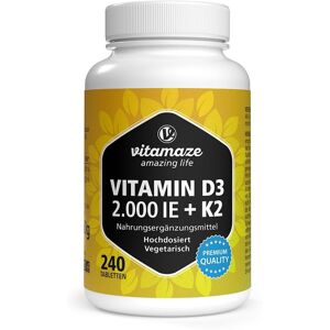 Anwendungsgebiet von Vitamin D3 2000 IE + K2 TablettenVitamin D3 2000 IE + K2 Tabletten- Vitamin D3 und K2 als Synergie-VitamineBestimmte Lebenssituationen können dazu führen, dass nicht genug Sonneneinstrahlung auf die menschliche Haut gelangt und der Körper nicht ausreichend mit Vitamin D3 versorgt wird. Daher kann bei bestehendem Vitamin-D3-Mangel eine hochdosierte Nahrungsergänzung sinnvoll sein. Vitamin K2 unterstützt den Körper bei der Aufnahme und Verarbeitung von Vitamin D3.Wirkstoffe / Inhaltsstoffe / ZutatenVitamin D3 2000 IE + K2 Tabletten enthält:Füllstoff (Mikrokristalline Cellulose), Cholecalciferol (Vitamin D3), Menachinon MK7 (Vitamin K2).DosierungAnwendungsempfehlung von Vitamin D3 2000 IE + K2 Tabletten:Alle 2 Tage 1 Tablette mit ausreichend Wasser einnehmen.SchwangerschaftWährend der Schwangerschaft und Stillzeit sollte generell vor dem Verzehr von Nahrungsergänzungsmitteln ein Arzt konsultiert werden.HinweiseDas Produkt ungeöffnet, kühl, trocken und außerhalb der Reichweite von Kindern aufbewahren.Die angegebene empfohlene Verzehrmenge darf nicht überschritten werden.Nahrungsergänzungsmittel sind kein Ersatz für eine ausgewogene und abwechslungsreiche Ernährung und eine gesunde Lebensweise. Nicht für Kinder und Jugendliche geeignet. Vitamin D3 2000 IE + K2 Tabletten können in Ihrer Versandapotheke www.juvalis.de erworben werden.