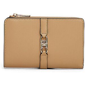 Damen Geldbörse aus glattem Lederimitat Aufklappbar mit Druckknopfverschluss Ein Geldscheinfach Ein Münzfach mit Reißverschluss Zwei Seitenfächer Acht Kreditkartenfächer Logo-Emblem auf der Vorderseite Farbbezeichnung: Khaki Material: 100% Polyurethan