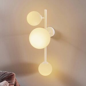 Die Wandleuchte Dione setzt sich aus einem rein weißem Stangengestell und drei Leuchtkugeln aus gefrostetem Glas zusammen. Eine Kugel ist etwas größer als die anderen beiden. Durch ihre unterschiedlichen Ausrichtungen kann ein großer Bereich problemlos erhellt werden. Dank der weißen Oberfläche tritt das Licht homogen und blendfrei nach außen.