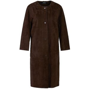 Der kragenlose Mantel aus Wildleder kommt in gerade geschnittener Form und Knielänge. Besondere Details sind die Patchwork-Nähte und dreiviertellangen Ärmel. Geschlossen wird der edle Mantel mit Druckknöpfen. Damen Mantel aus Wildleder Langarm Farbbezeichnung: Dark Wood Material: 100% Leder